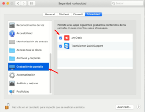 - Dentro de Seguridad y privacidad entramos en Grabación de pantalla y volvemos a activar los programas de acceso remoto.